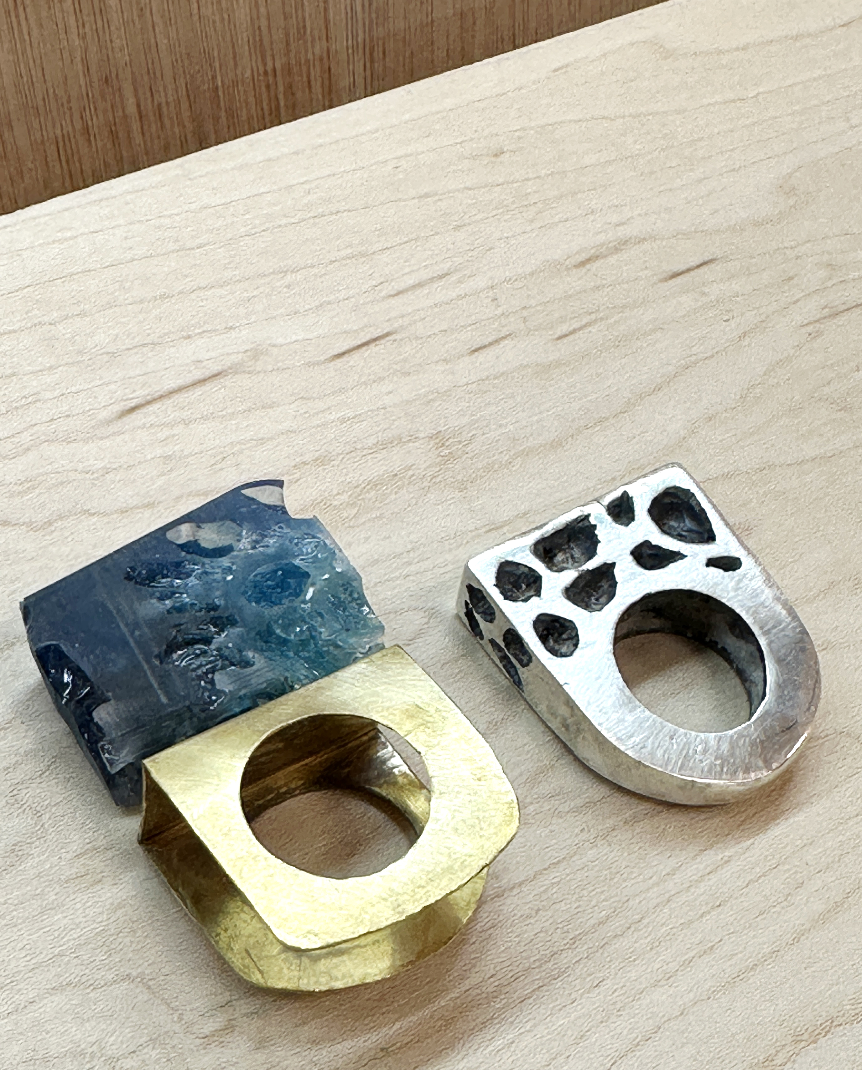 In addition to traditional metalworking methods, the course expands into the realms of wax carving, wood carving, silicon molding, and resin casting. The synthesis of these techniques empowered students to create unconventional and experimental accessories by combining wood, silicon, resin, and metal.